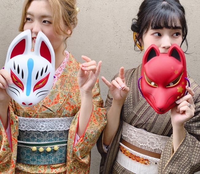 使用狐狸面具带着童趣拍照玩乐。